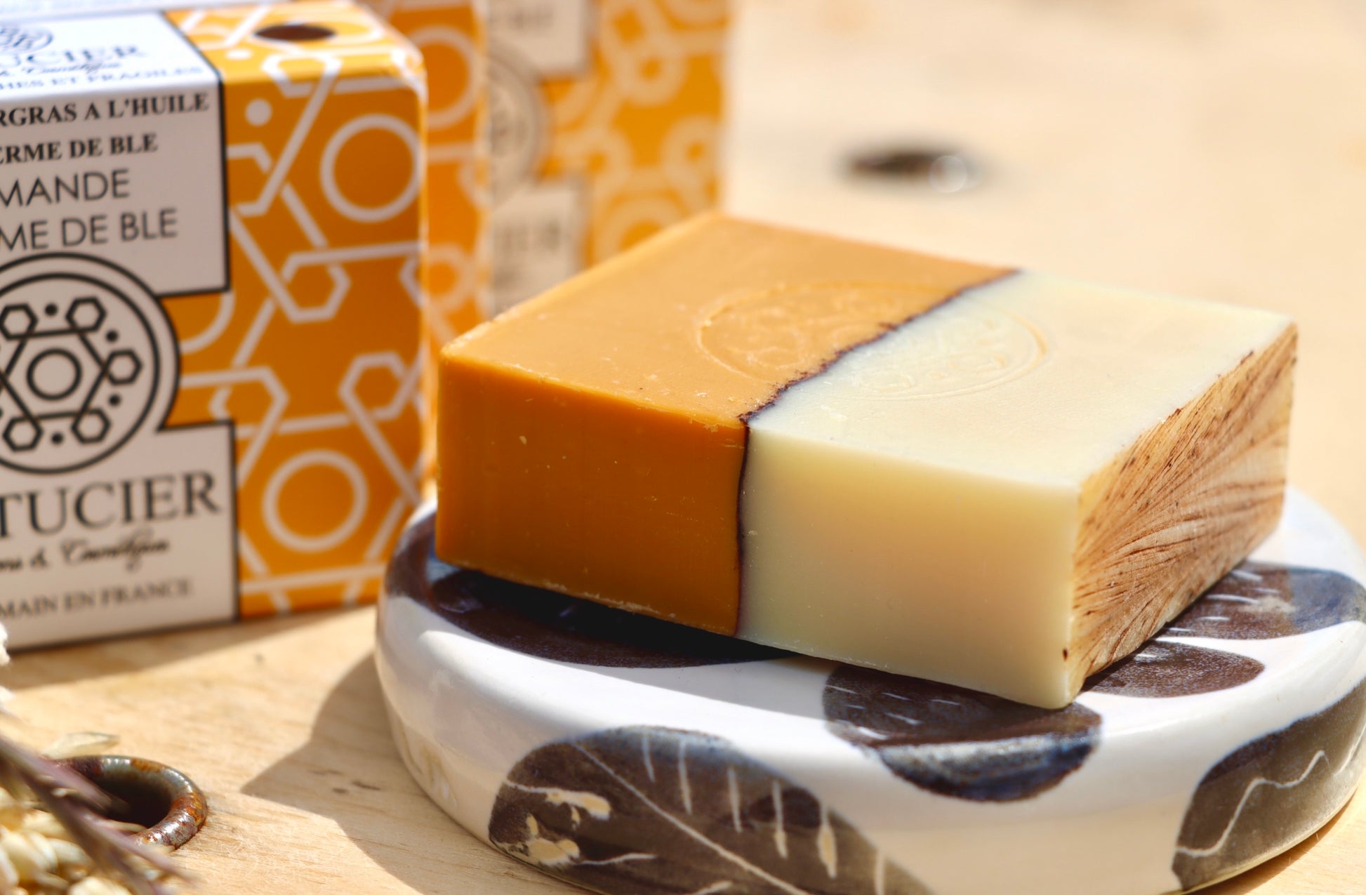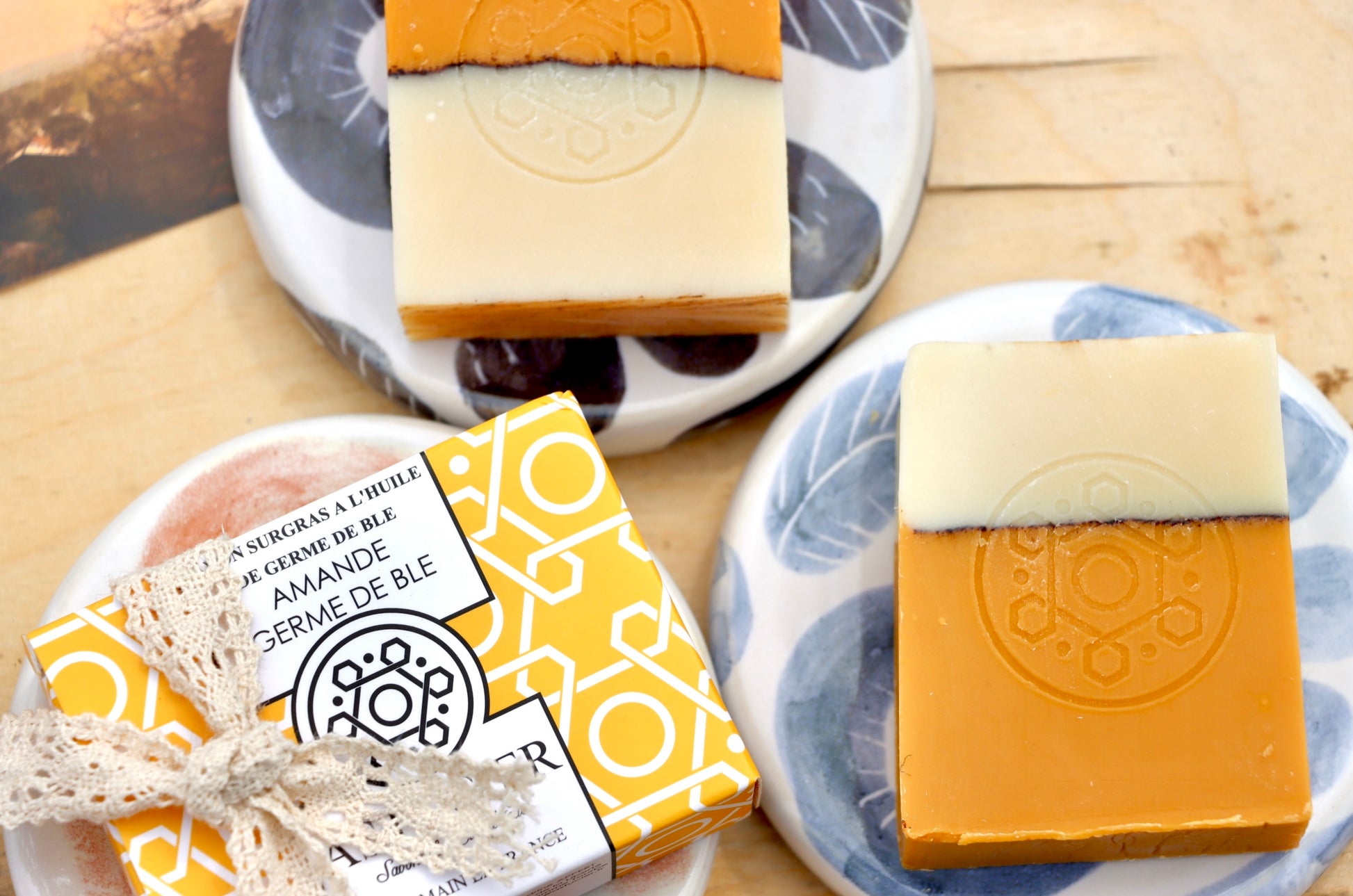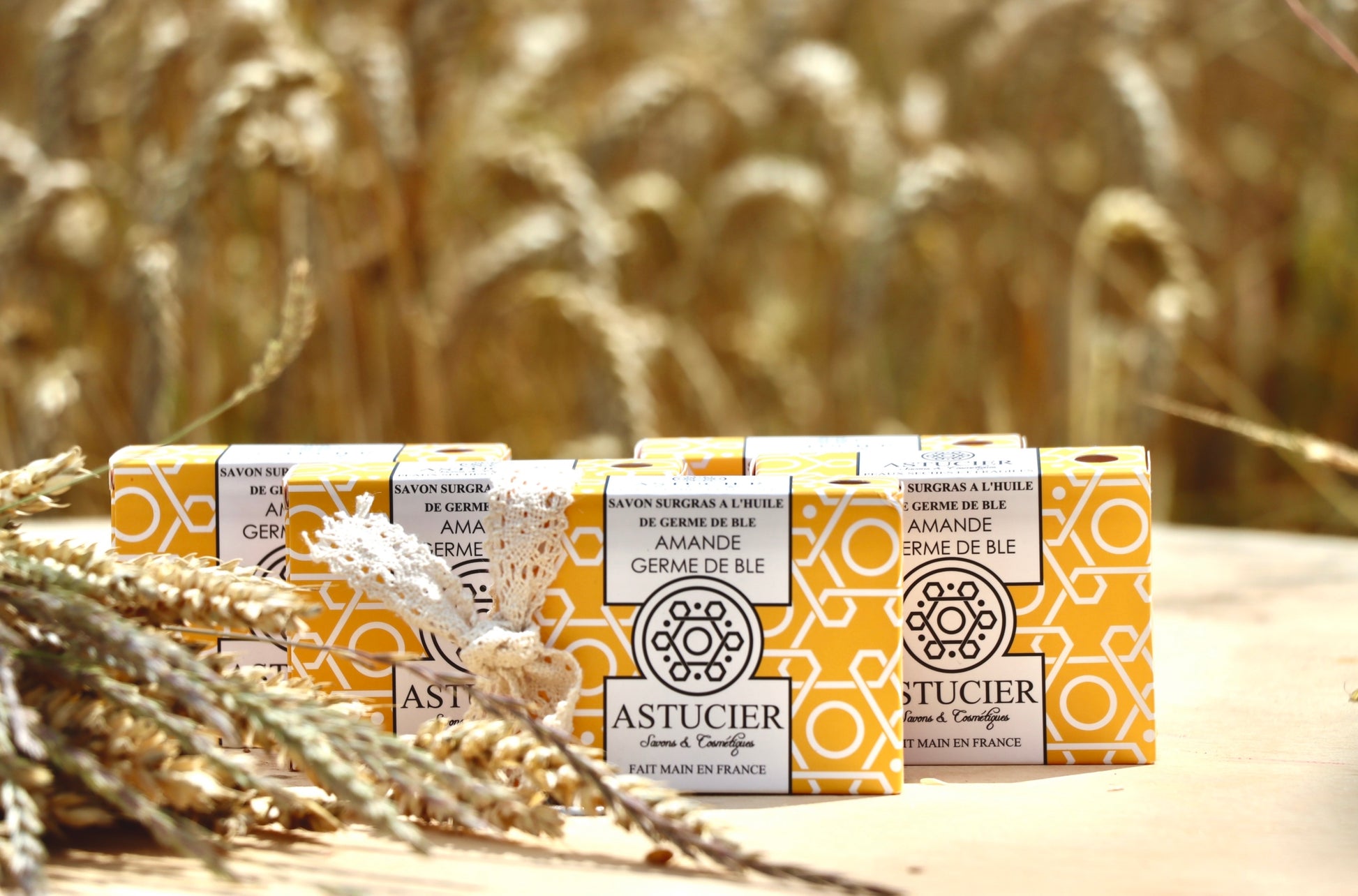 - D'un savon artisanal de 100 g à l'amande et germe de blé, fabriqué par L'Astucier à Somme Tourbe