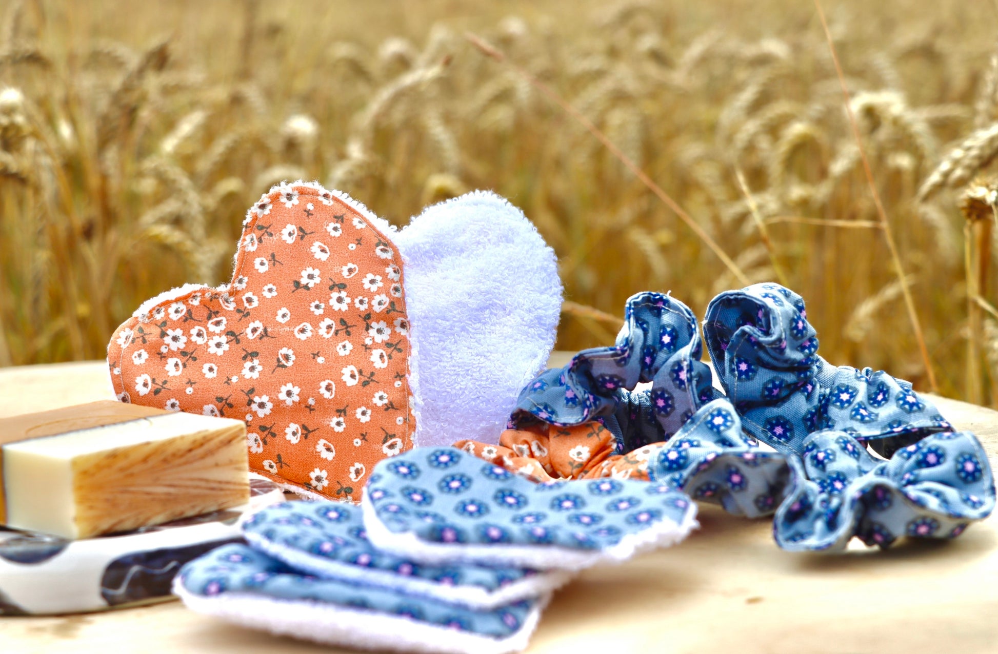 - De 4 lingettes réutilisables et d'un chouchou en tissu cousus main
