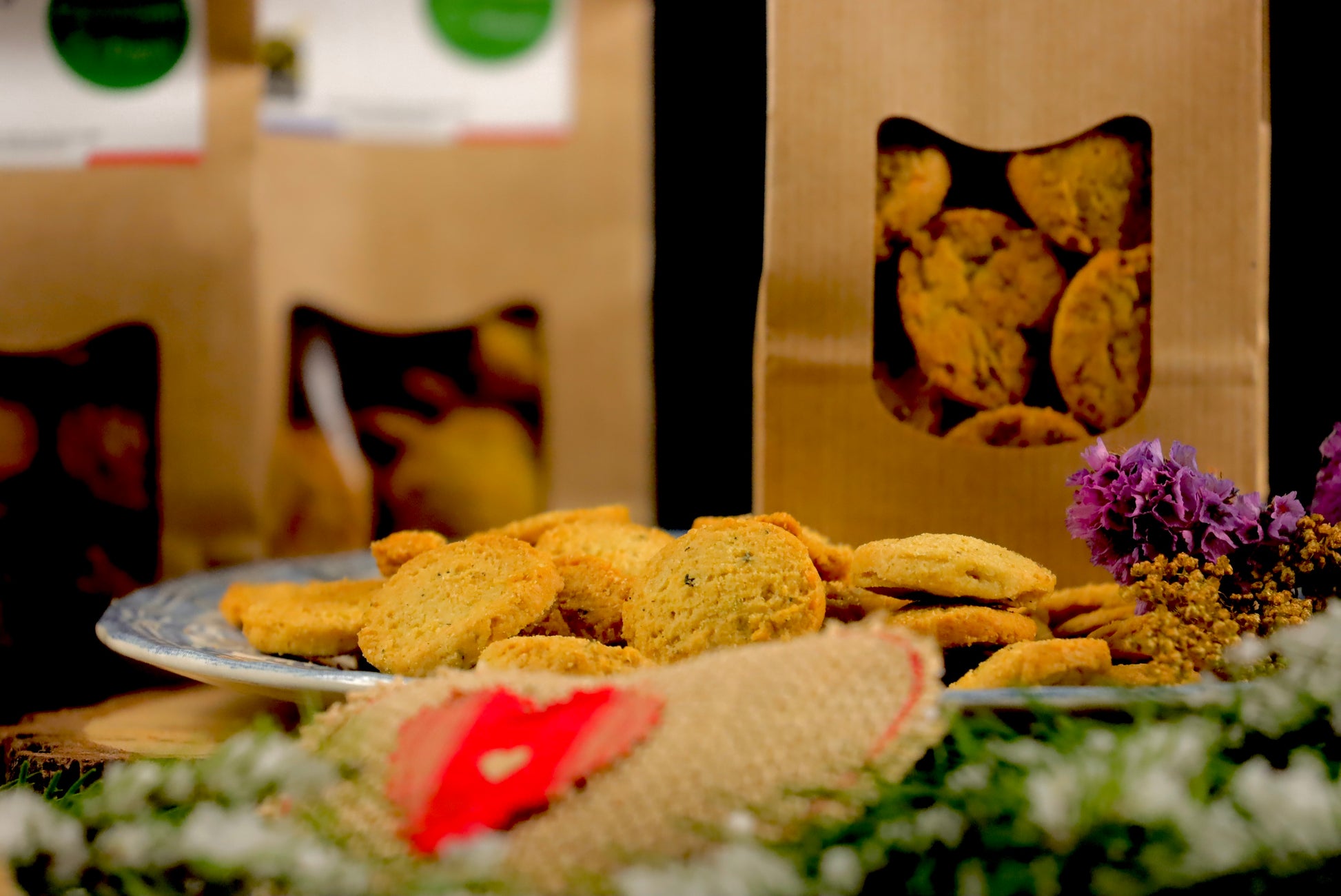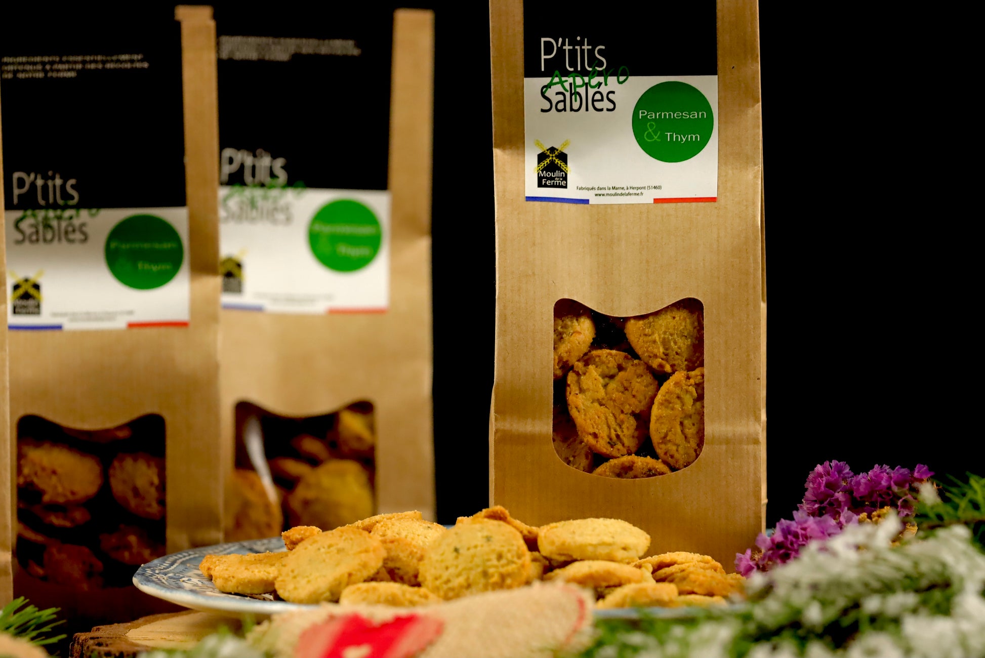 - D'un paquet de sablés apéritifs au Parmesan et au Thym, du Moulin de la ferme Cotton-Haller à Herpont. (Marne)